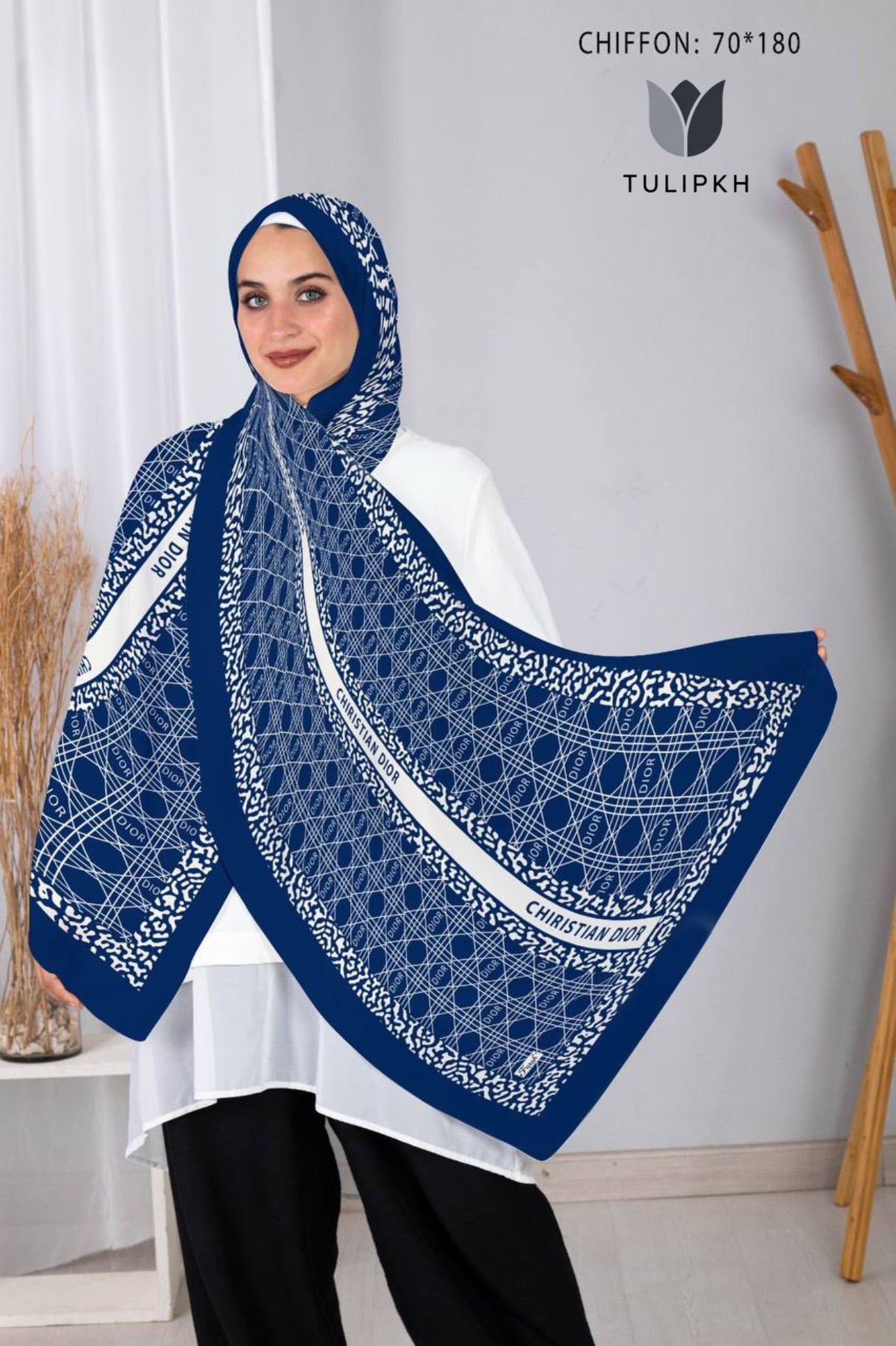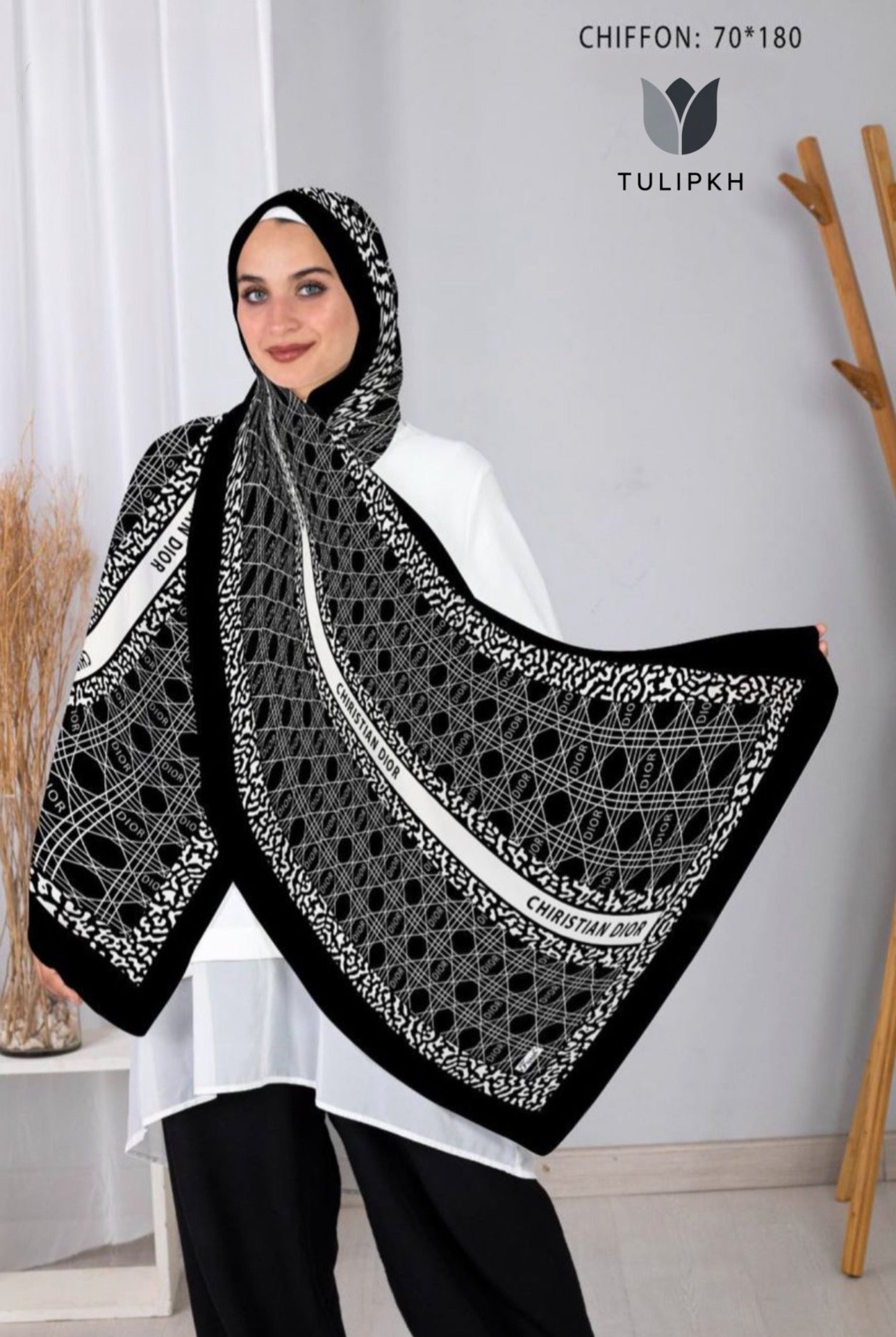 Discover the luxurious elegance of the Dior printed scarf. Made from high-quality chiffon, this scarf boasts a modest yet stylish design that will elevate any outfit. Perfect for adding a touch of sophistication and refinement to your wardrobe.